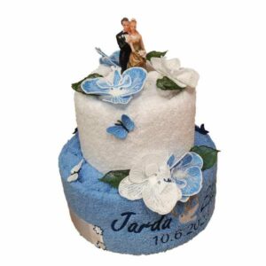 textilní svatební dorty z ručníků a osušek není jen dárek, ale poslouží také jako praktická dekorace. Originální výzdoba svatební hostiny, kterou následně novomanželé použijí i prakticky. Netradiční textilní dorty svatební od Isabelky poslouží hned dvakrát. Mezi nejvíce oblíbené patří svatební dorty v barvě bílá, fialová, vínová a nebo světle zelená. Pokud v nabídce svatebních dortů nenajdete vaši oblíbenou barevnou kombinaci, rádi Vám ji vytvoříme. Za předpokladu, že taková barva froté ručníku a osušky je v naší nabídce. Textilní svatební dorty z ručníků a osušek můžeme udělat z více jak 15-ti nabízených barev a kombinaci nebo obarvit organzou či vyšívaným vzorem jako doplněk. Zdobení bude přizpůsobeno dle vybrané barevné kombinace. Netradiční dárky v podobě svatebních dortů si můžete u nás nechat doplnit o vyšívanou ozdobou. V nabídce máme také originální svatební dorty třípatrové nebo svatební dorty čtyřpatrové. Mezi nejvíce oblíbené vyšívané ozdoby k dortům patří jména snoubenců nebo monogram, ale také blahopřání. Jsme schopni nechat vyšít i obrazový materiál který následně můžete použít u textilních dortů jako doplněk. Textilní dorty se hodí i k oslavám výročí svatby a nebo můžete tento typ dvoupatrových dortů použít také jako dárek k narozeninám. Použitelnost textilních dárků je velká a hlavně praktická.